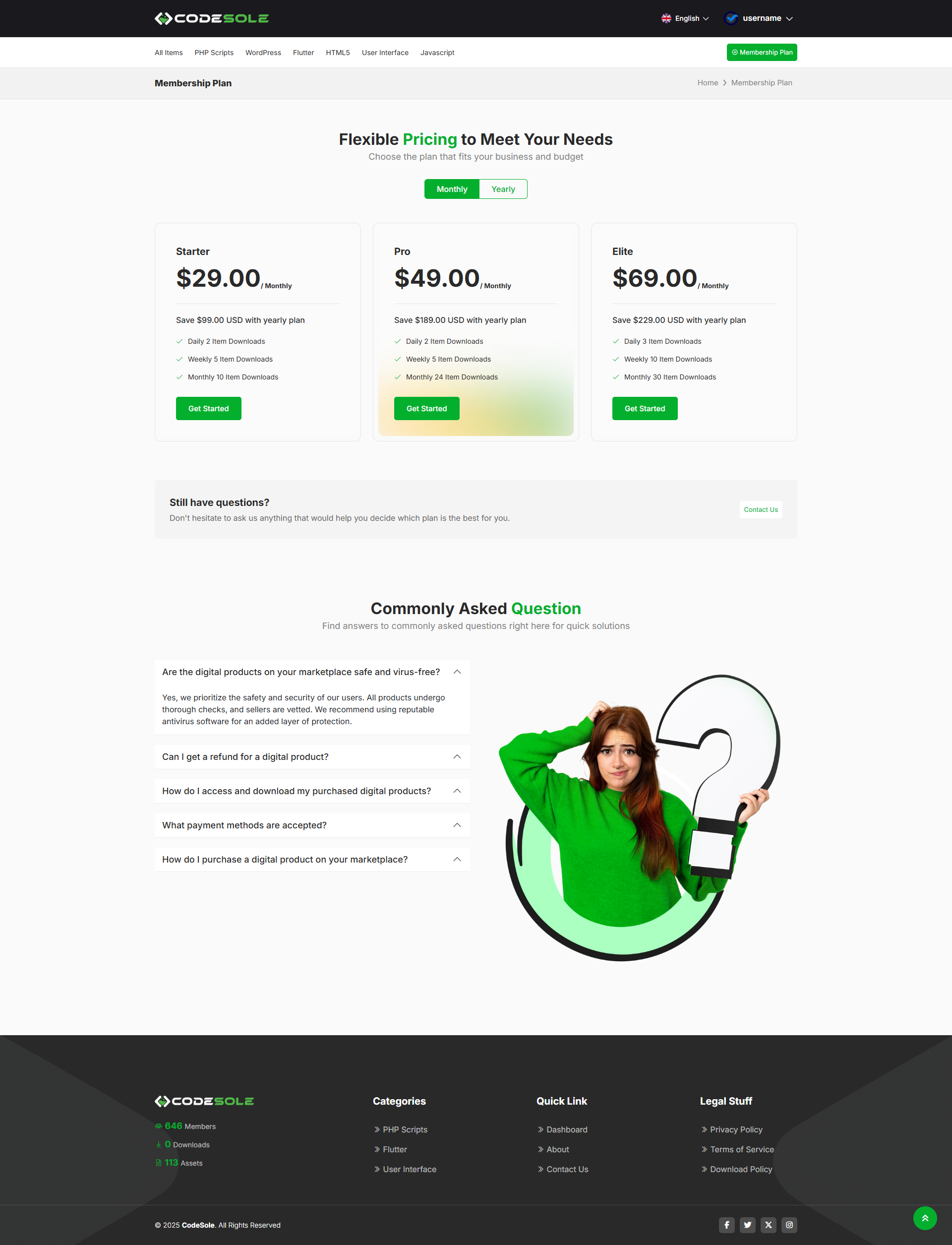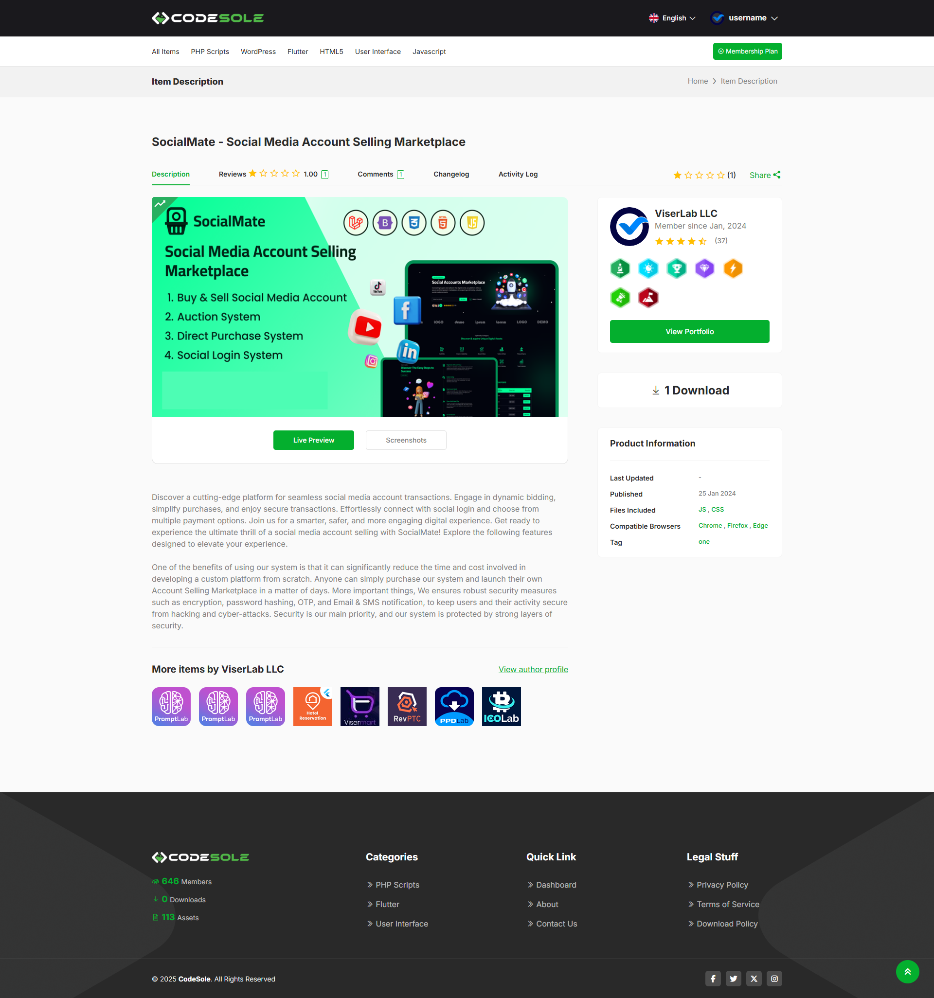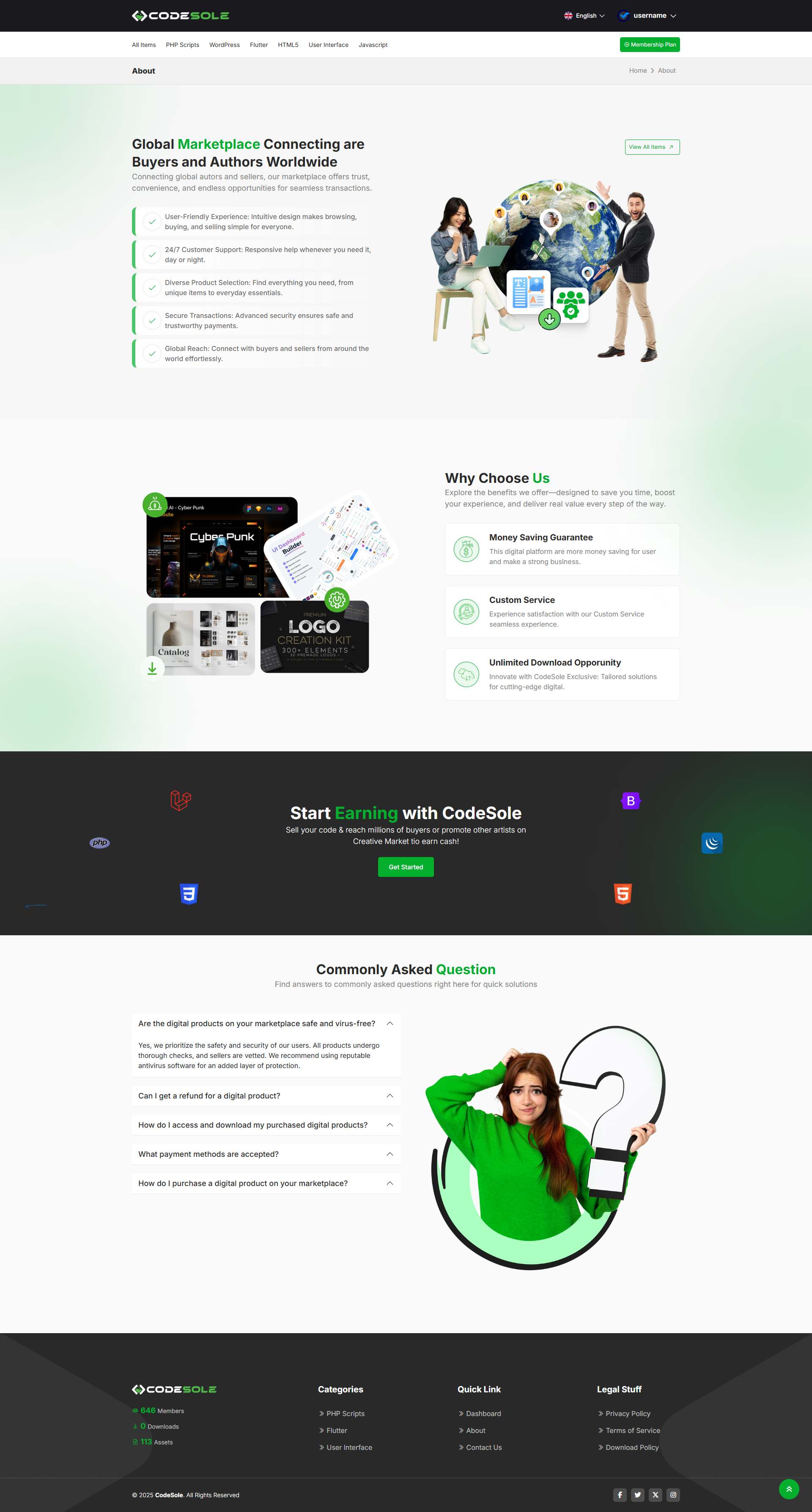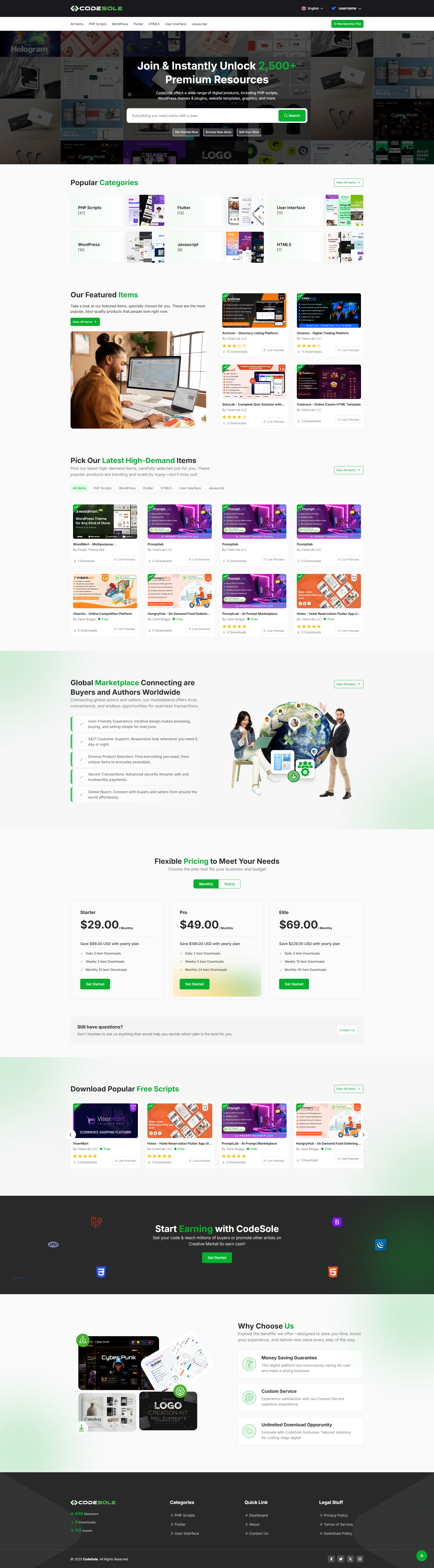 CodeSole is a subscription-based Code and template Selling Marketplace that gives users access to a large library of digital assets. These include things like Codes, Scripts, tools, stock photos, videos, music tracks, website templates, fonts, and graphic design elements. Once a user subscribes, he is able to download and use as many items as he need, depending on membership plans. No extra cost for each download. Normally, the license covers both personal and commercial projects, as long as a user downloads each item before use. This concept becomes very useful for Coders, designers, video editors, marketers, and other creatives who need high-quality content for their work.